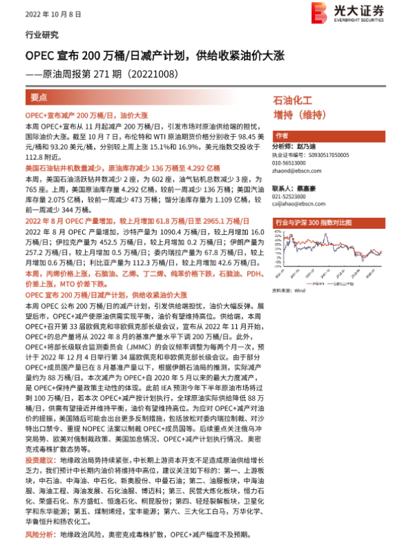 【光大证券】【20221008】OPEC宣布200万桶 日减产计划,供给收紧油价大涨-13页 行业研究