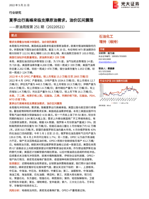 【光大证券】【20220521】20220521-光大证券-原油周报第251期:夏季出行高峰来临支撑原油需求,油价区间震荡-11页 行业研究