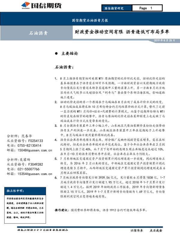 【国信期货】【20190825】石油沥青月报:财政资金推动空间有限,沥青逢低可布局多单-15页 行业研究