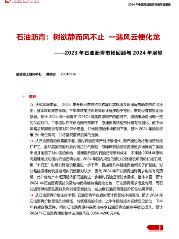 【方正中期期货】【20240109】2023年石油沥青市场回顾与2024年展望:石油沥青:树欲静而风不止 一遇风云便化龙-24页 行业研究