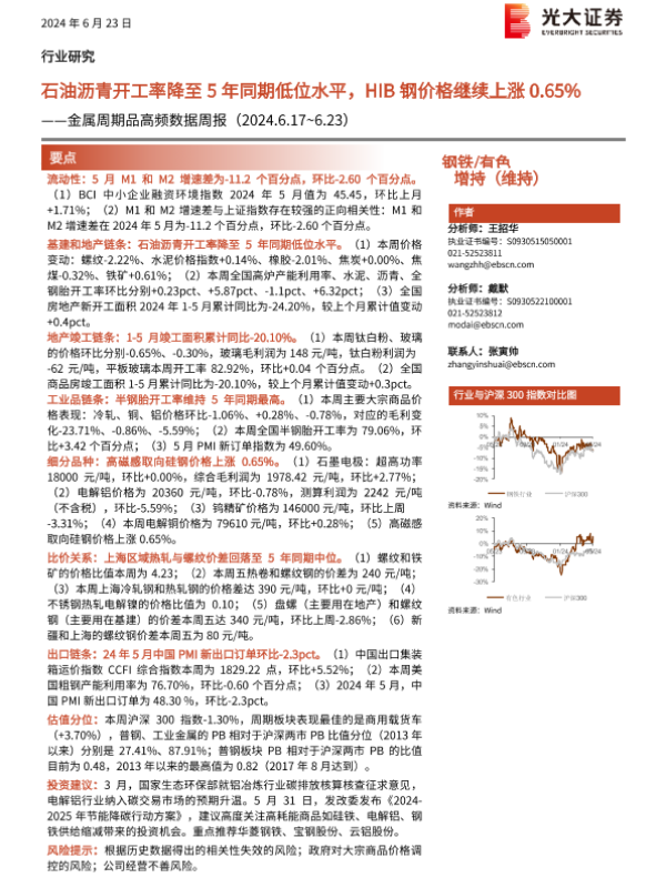 【光大证券】【20240623】20240623-光大证券-钢铁 有色行业金属周期品高频数据周报:石油沥青开工率降至5年同期低位水平,HIB钢价格继续上涨0.65%-27页 行业研究