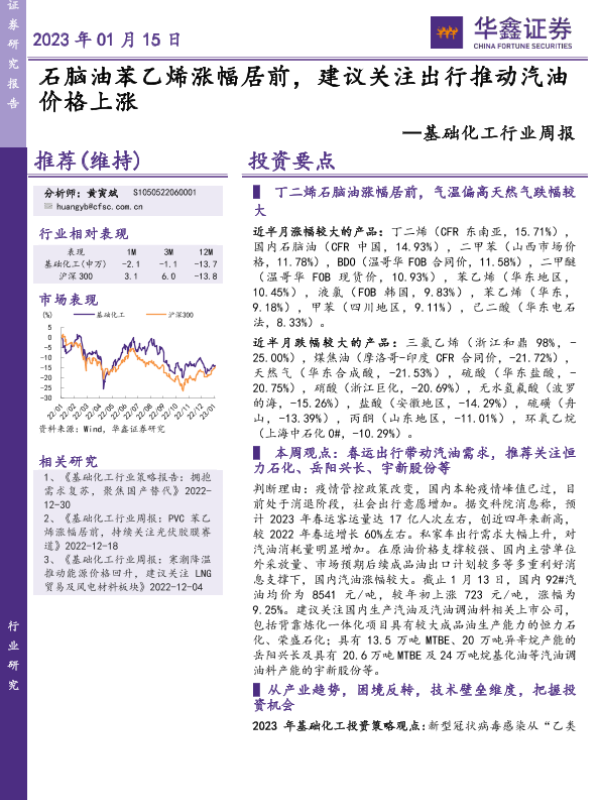 【华鑫证券】【20230115】20230115-华鑫证券-基础化工行业周报:石脑油苯乙烯涨幅居前,建议关注出行推动汽油价格上涨-40页 行业研究
