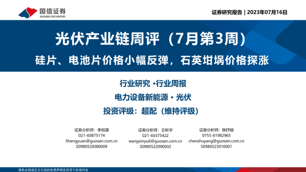 【国信证券】【20230716】20230716-国信证券-光伏产业链周评(7月第3周):硅片、电池片价格小幅反弹,石英坩埚价格探涨-17页 行业研究