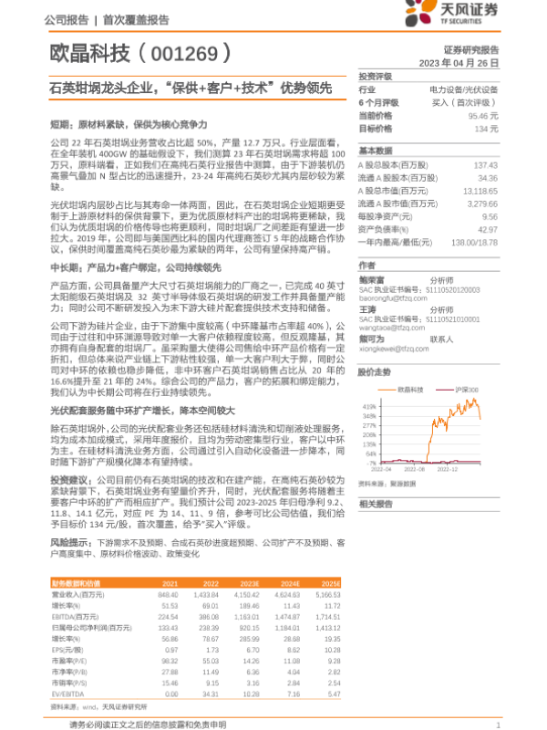 【天风证券】【20230426】欧晶科技-001269.SZ-石英坩埚龙头企业,“保供+客户+技术”优势领先-19页 行业研究