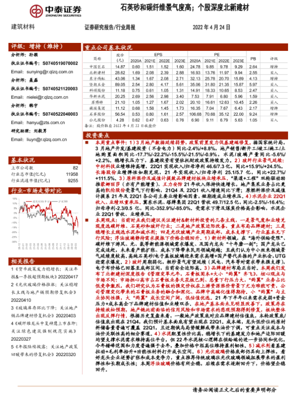 【中泰证券】【20220424】石英砂和碳纤维景气度高;个股深度北新建材-27页 行业研究