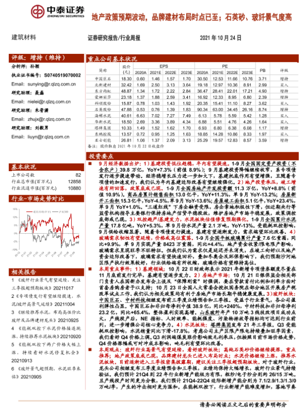 【中泰证券】【20211024】建筑材料行业周报:地产政策预期波动,品牌建材布局时点已至;石英砂、玻纤景气度高-25页 行业研究