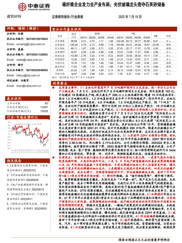 【中泰证券】【20220710】建筑材料行业周报:碳纤维企业发力全产业布局;光伏玻璃龙头竞夺石英砂储备-27页 行业研究