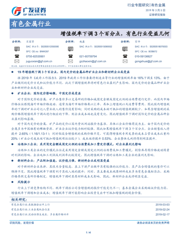 【广发证券】【20190305】20190305-广发证券-有色金属行业专题研究:增值税率下调3个百分点,有色行业受益几何-4页 行业研究