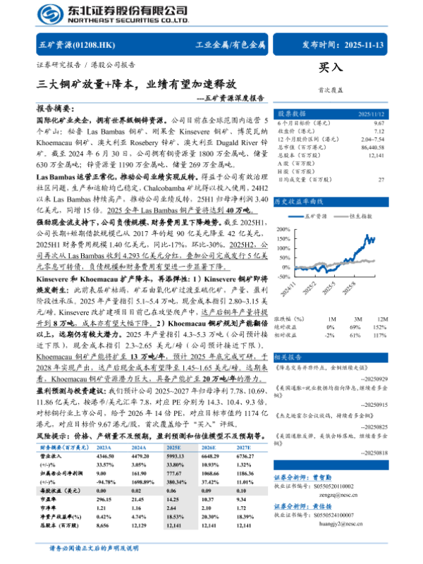 【东北证券】【202511】五矿资源深度报告:三大铜矿放量+降本,业绩有望加速释放-35页 证券期货研究报告