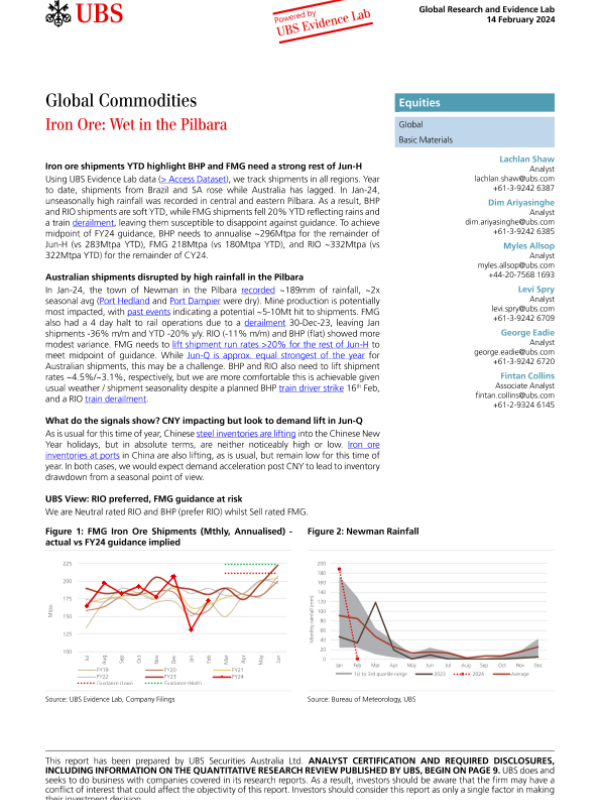 【UBS Securities Australia Ltd.】【20240214】Iron Ore Wet in the Pilbara-20页 行业研究