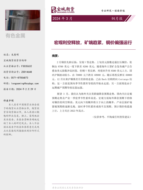 【宝城期货】【20240229】铜月报:宏观利空释放,矿端趋紧,铜价偏强运行-20页 行业研究