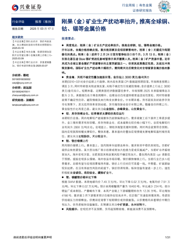 【兴业证券】【20250317】20250317-兴业证券-有色金属行业周报:刚果(金)矿业生产扰动率抬升,推高全球铜、钴、锡等金属价格-31页 行业研究