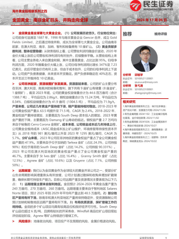 【民生证券】【20241106】2024年11月18日更新-【民生证券】有色金属行业海外黄金股观察系列之四:金田黄金,南非金矿巨头,并购走向全球-40页 行业研究