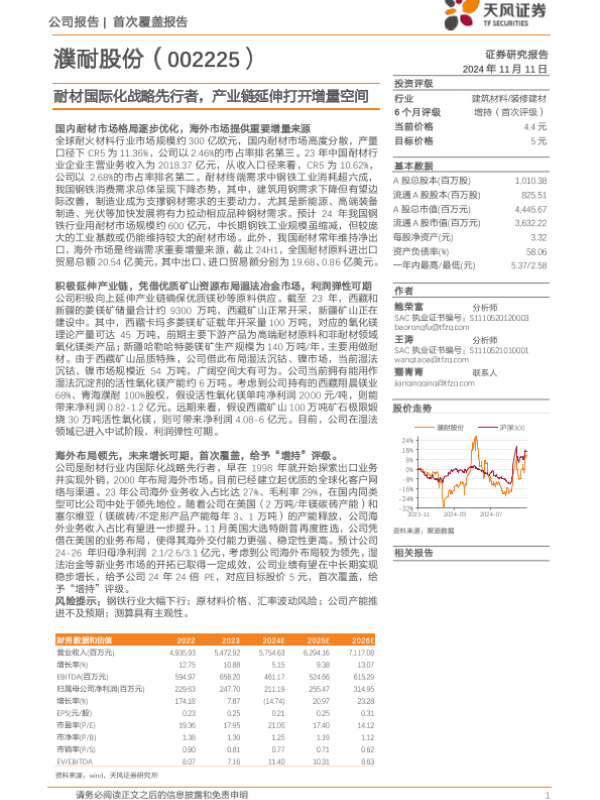 【天风证券】【20241111】耐材国际化战略先行者,产业链延伸打开增量空间-24页 行业研究