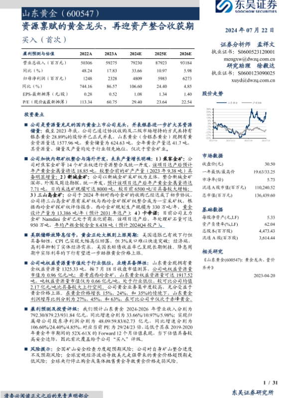 【东吴证券】【20240722】山东黄金(600547)资源禀赋的黄金龙头,再迎资产整合收获期-31页 行业研究