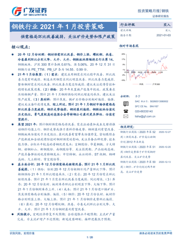 【广发证券】【20210103】钢铁行业2021年月投资策略:供需格局环比改善减弱,关注矿价走势和限产政策-20页 行业研究
