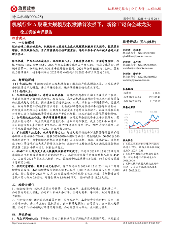 【浙商证券】【202512】机械行业A股最大规模股权激励首次授予,新徐工迈向全球龙头——徐工机械点评报告-6页 证券期货研究报告