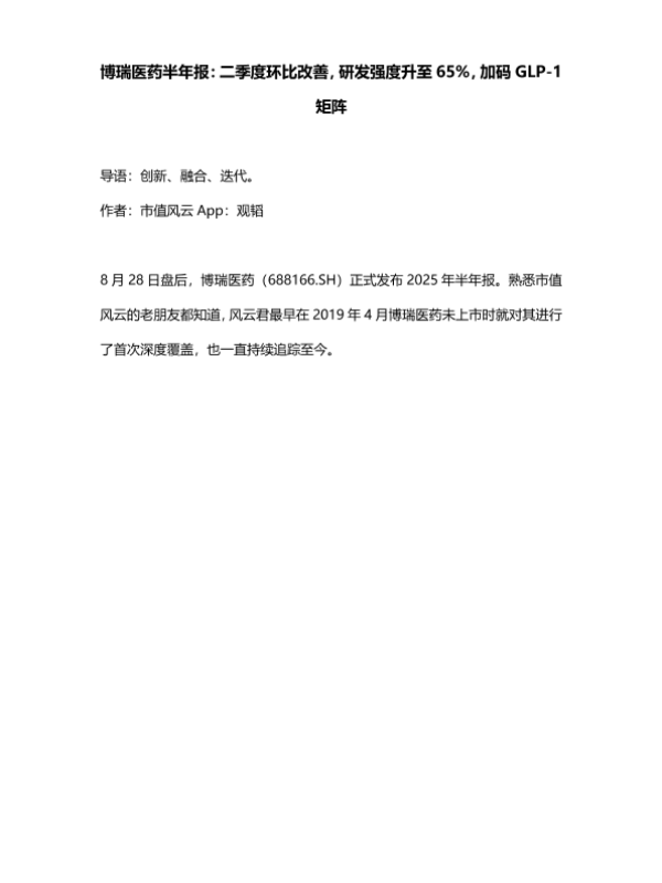 【市值风云 App 观韬】【20250829】博瑞医药-半年报:二季度环比改善,研发强度升至65%,加码GLP-1矩阵-13页 财报