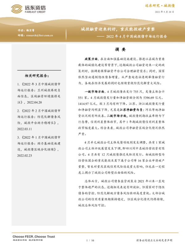【远东资信】【20220520】2022年4月中国城投债市场运行报告:城投融资迎来利好,重庆能投破产重整-16页 行业研究
