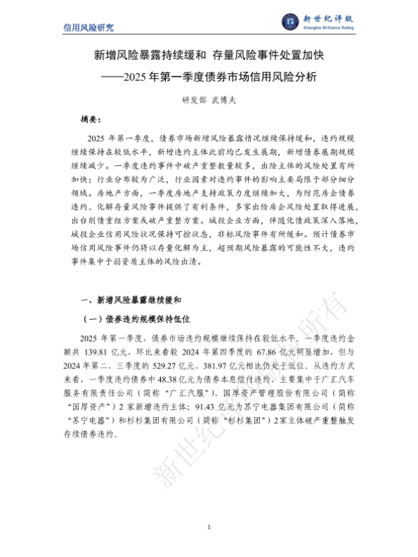 【研发部 武博夫】【202501】新增风险暴露持续缓和 存量风险事件处置加快——2025年第一季度债券市场信用风险分析-11页 证券期货研究报告