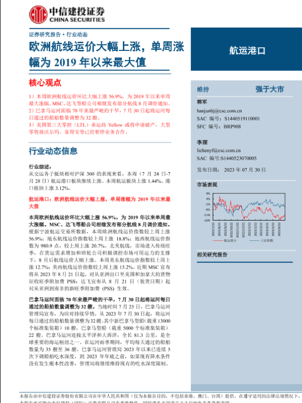 【中信建投证券】【20230730】航运港口行业:欧洲航线运价大幅上涨,单周涨幅为2019年以来最大值-26页 行业研究