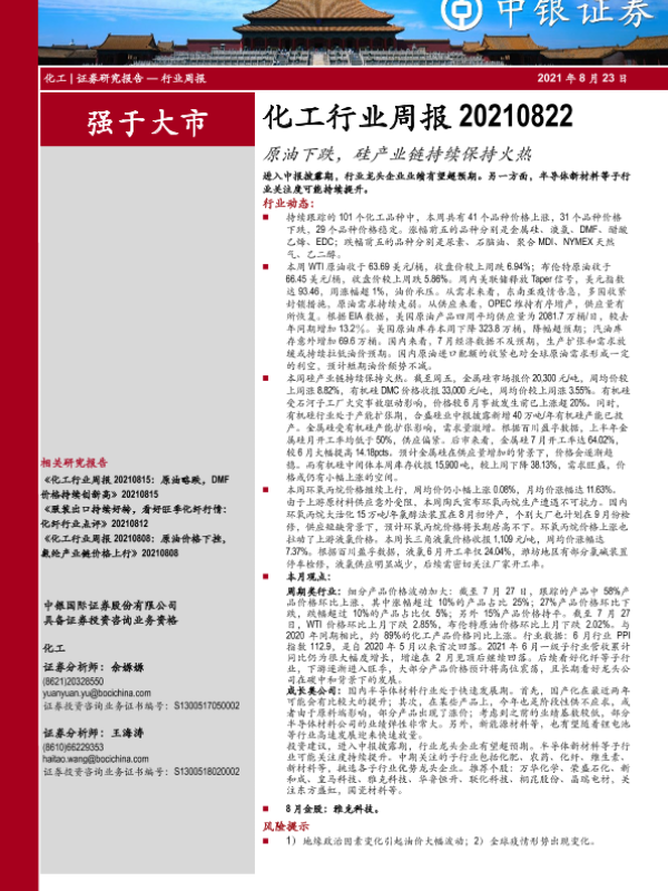 【中银证券】【20210823】20210823-中银证券-化工行业周报:原油下跌,硅产业链持续保持火热-11页 行业研究
