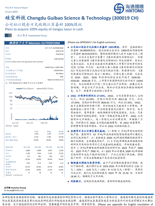 【海通国际】【20240613】硅宝科技(300019)公司拟以现金方式收购江苏嘉好100%股权-13页 行业研究