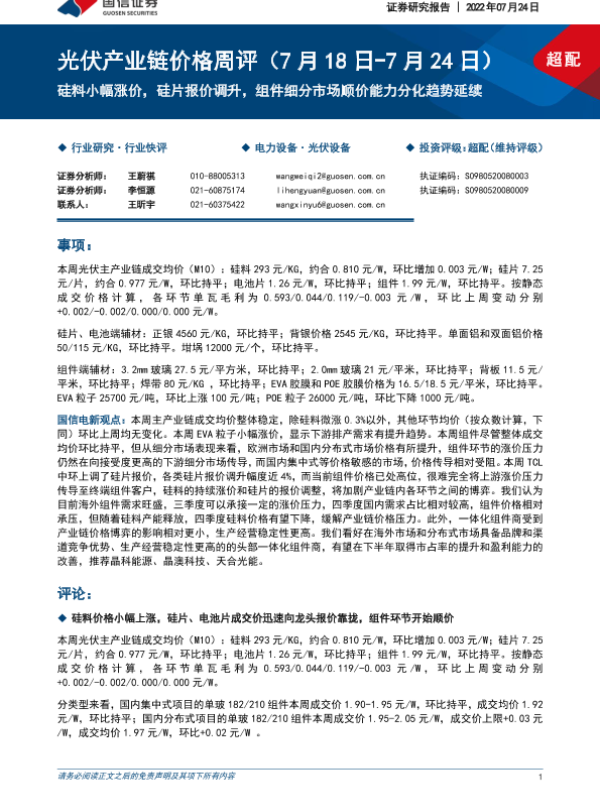 【国信证券】【20220724】光伏产业链价格周评:硅料小幅涨价,硅片报价调升,组件细分市场顺价能力分化趋势延续-8页 行业研究