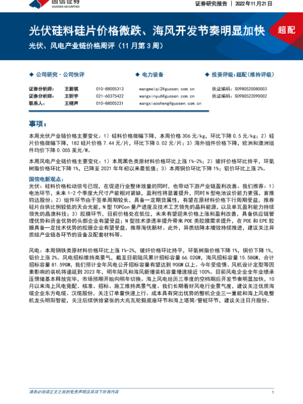 【国信证券】【20221121】光伏、风电产业链价格周评(11月第3周):光伏硅料硅片价格微跌、海风开发节奏明显加快-12页 行业研究