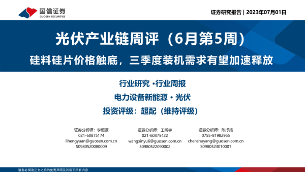 【国信证券】【20230701】光伏产业链周评(6月第5周):硅料硅片价格触底,三季度装机需求有望加速释放-16页 行业研究