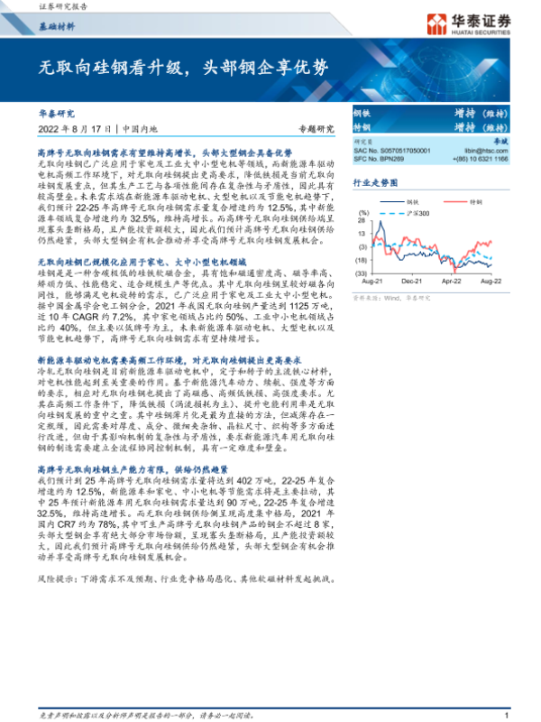 【华泰证券】【20220817】基础材料专题研究:无取向硅钢看升级,头部钢企享优势-12页 行业研究