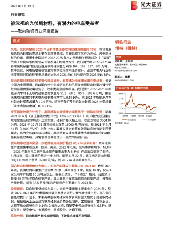 【光大证券】【20220719】20220719-光大证券-取向硅钢行业深度报告:被忽视的光伏新材料,有潜力的电车受益者-17页 行业研究