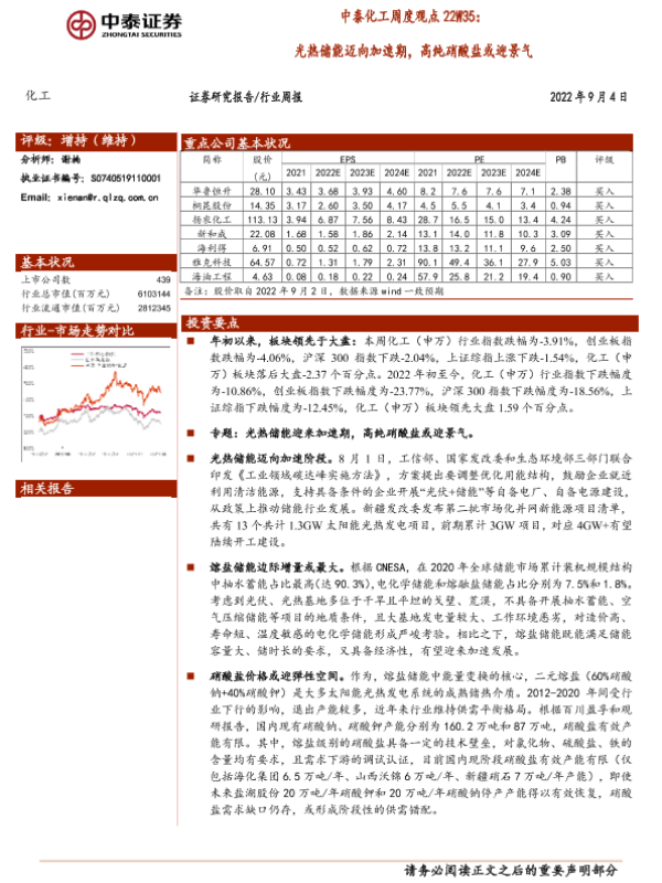 【中泰证券】【20220904】中泰化工周度观点22W35:光热储能迈向加速期,高纯硝酸盐或迎景气-31页 行业研究