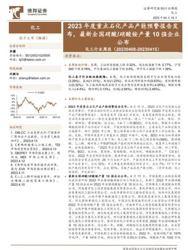 【德邦证券】【20230416】化工行业周报:2023年度重点石化产品产能预警报告发布,最新全国硝酸硝酸铵产量10强企业公布-26页 行业研究