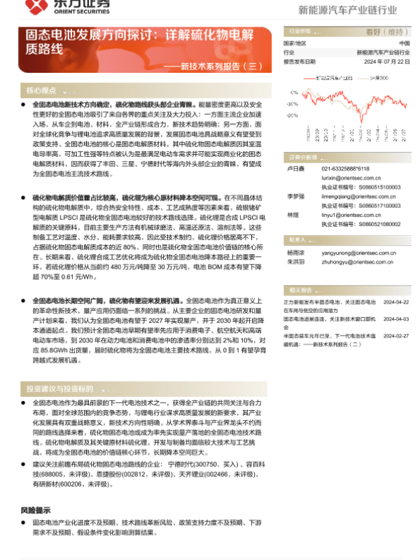 【东方证券】【20240722】新能源汽车产业链行业:新技术系列报告(三):固态电池发展方向探讨:详解硫化物电解质路线-30页 行业研究