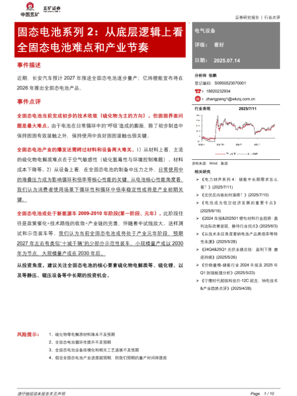 【五矿证券】【20250714】电气设备行业固态电池系列2:从底层逻辑上看全固态电池难点和产业节奏-10页 证券期货研究报告