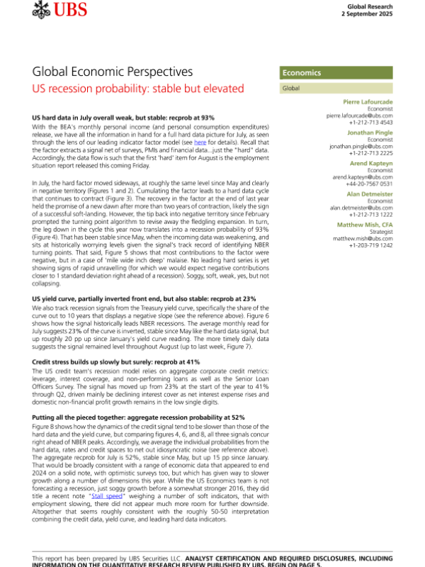 【UBS Securities LLC】【202509】Global Economic Perspectives _US recession probability stable but elevated-8页 宏观策略