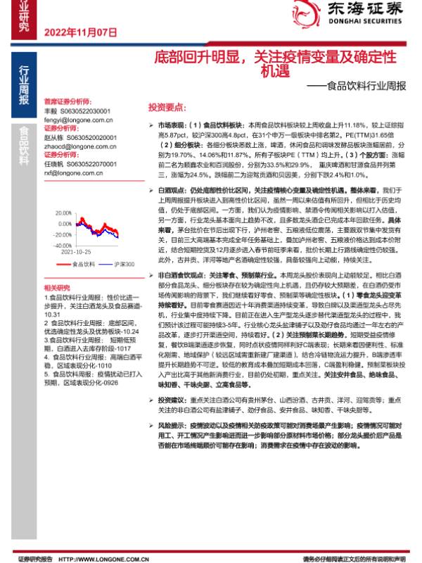 【东海证券】【20221107】20221107-东海证券-食品饮料行业周报:底部回升明显,关注疫情变量及确定性机遇-17页 行业研究