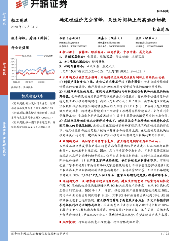 【开源证券】【20200531】20200531-开源证券-轻工制造行业周报:确定性溢价充分演绎,关注时间轴上的高低位切换-22页 行业研究