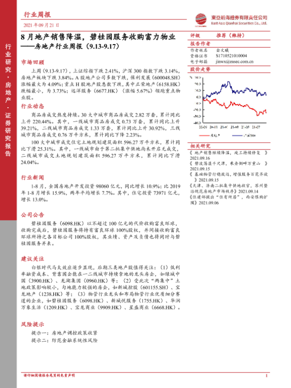 【东亚前海证券】【20210921】8月地产销售降温,碧桂园服务收购富力物业-15页 行业研究