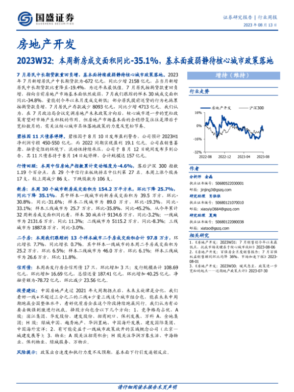 【国盛证券】【20230813】房地产开发2023W32:本周新房成交面积同比-35.1%,基本面疲弱静待核心城市政策落地-15页 行业研究