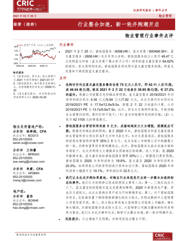 【克而瑞证券】【20210226】物业管理行业事件点评:行业整合加速,新一轮并购潮开启-3页 行业研究
