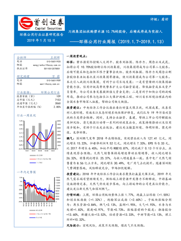 【首创证券】【20190115】环保公用行业周报:川投集团拟收购碧水源10.7%的股份,后续或将成为实控人-10页 行业研究