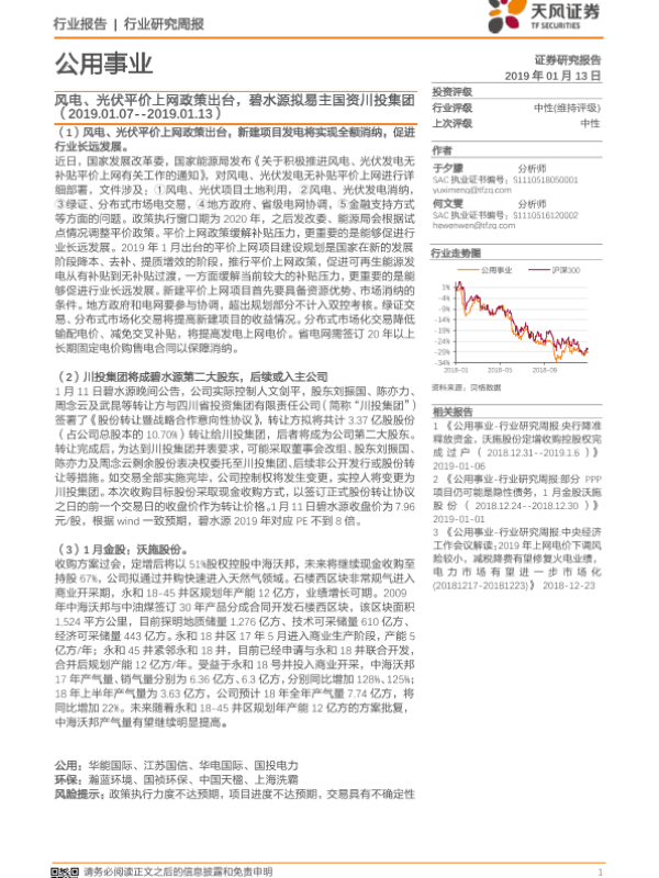 【天风证券】【20190113】公用事业行业研究周报:风电、光伏平价上网政策出台,碧水源拟易主国资川投集团-19页 行业研究