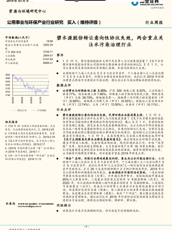 【国金证券】【20190304】公用事业与环保产业行业研究周报:碧水源股份转让意向性协议失效,两会重点关注水污染治理行业-13页 行业研究