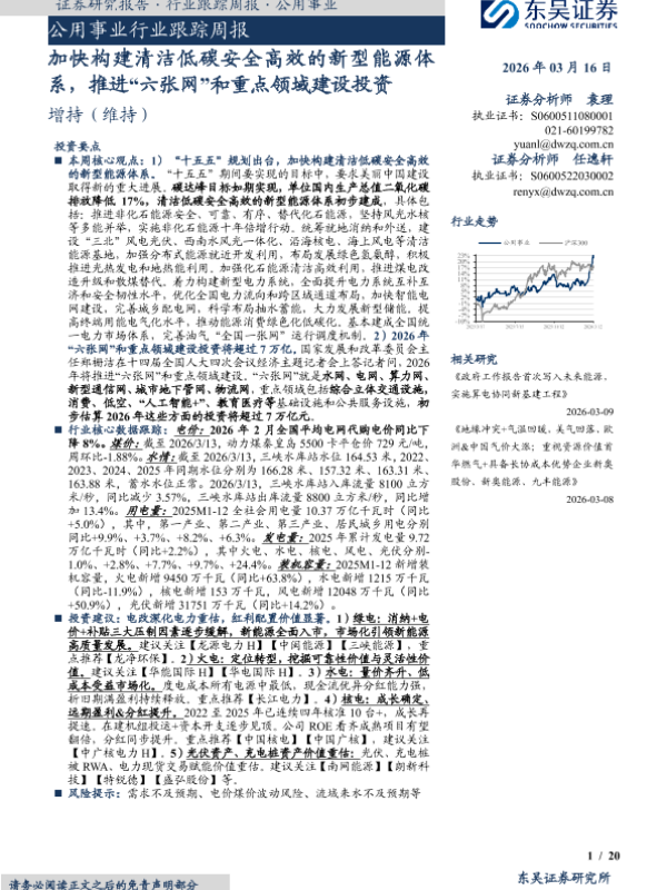 【东吴证券】【202603】公用事业行业跟踪周报·加快构建清洁低碳安全高效的新型能源体系,推进“六张网”和重点领域建设投资-20页 证券期货研究报告