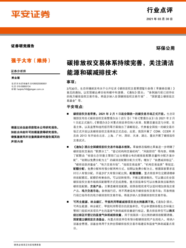 【平安证券】【20210330】环保公用行业点评:碳排放权交易体系持续完善,关注清洁能源和碳减排技术-3页 行业研究