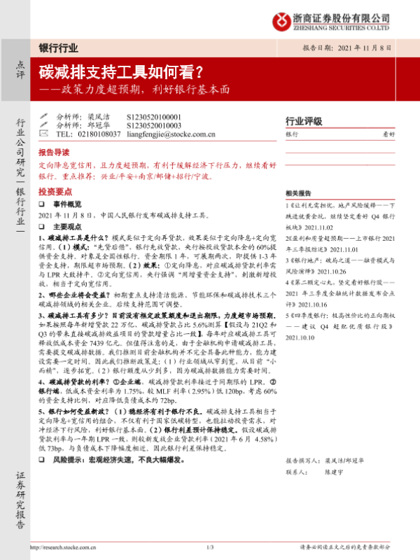 【浙商证券】【20211108】政策力度超预期,利好银行基本面:碳减排支持工具如何看?-3页 行业研究