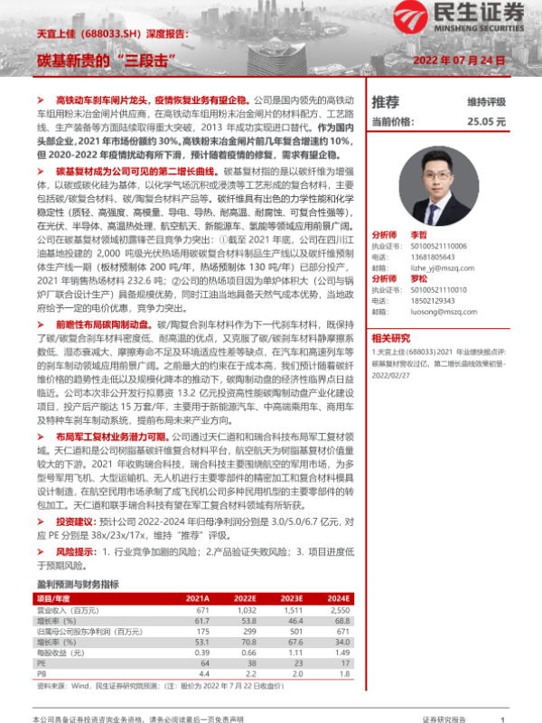 【民生证券】【20220724】20220724-民生证券-天宜上佳-688033.SH-深度报告:碳基新贵的“三段击”-38页 行业研究