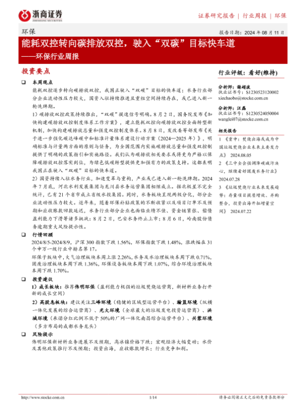 【浙商证券】【20240811】环保行业周报:能耗双控转向碳排放双控,驶入“双碳”目标快车道-14页 行业研究